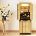 ツートンカラーデザインの「リスン201 タモ・ウォールナットコンビ」。明るいタモにウォールナットをアクセントに使うことで、よりお部屋に馴染むお仏壇に仕上がりました。内陣には木の年輪をモチーフにした陶磁器がデザインされ、モダンな空間を演出します。照明は上下に広がる木漏れ日がイメージされており、ご本尊様を明るく温かく荘厳します。 収納の面ではスライド式の仏具板や収納引き出し、骨壺が入る下台収納が完備されています。約120cmと小型な床置き仏壇でありながら、使いやすさとデザイン性の高さはそのまま維持されている点が特徴です。また、椅子に座っても、床に正座しても、どちらでもお祈りのしやすいサイズ感です。