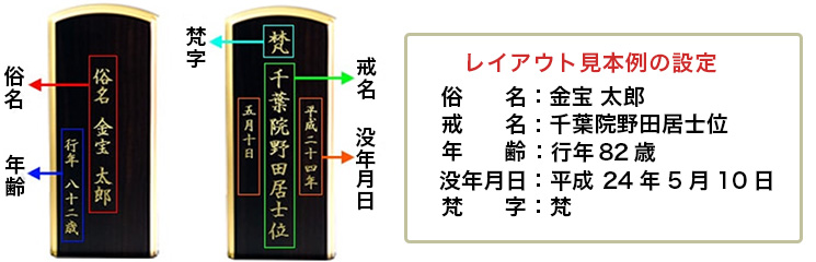 ※レイアウト例には「梵字」「俗名」「位」「行年」などの文字が入っておりますが、あくまで例としてご覧ください。「梵字」「俗名」「位」「行年」などの文字や、年月日などはお客様がご指定ください。