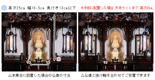 仏像設置する際は、高さ25cm 幅16.5cm 奥行き13cmまでの仏像がご安置可能です。※手前に配置した場合、天井ライトまで高さ33cm