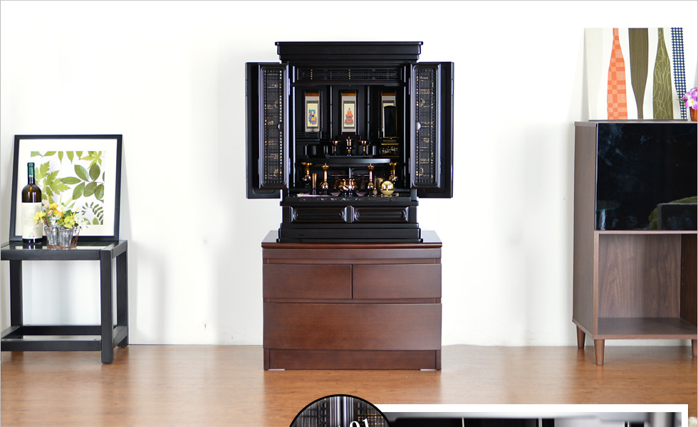 | ■ 商品説明 | シンプルなデザインと奥深い色合いが印象的な唐木ミニ仏壇『白楽 黒檀』。 格調高い伝統的な様相を保ちながらも、現代の住宅事情にマッチするよう控え目でシンプルにデザインされています。また、高級素材として知られる黒檀を贅沢に使用する事により、とても趣深い空間を演出し、和室はもちろん、洋室にも違和感なく馴染みます。 さらに猫戸や引き出し2杯など収納も充実し、実際にご使用になる際の利便性も考慮されたお仏壇ですので、末永く使って頂ける情緒溢れる商品に仕上がっております。 |