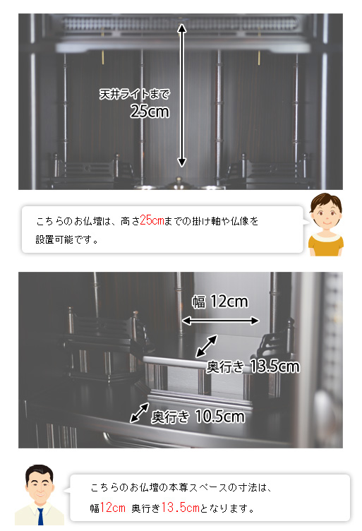 仏像設置する際は、高さ25cm 幅12cm 奥行き13.5cmまでの仏像がご安置可能です。
