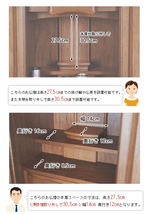 仏像設置する際は、高さ21.5cm 幅14cm 奥行き12cmまでの仏像がご安置可能です。※須弥壇取り外しで高さ24.5cm