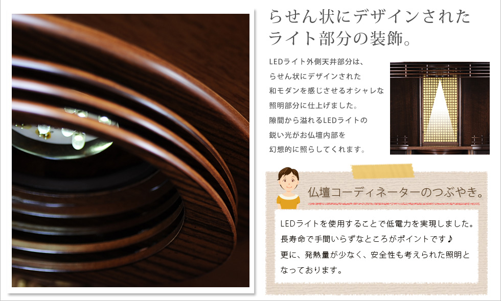 伝統ある雰囲気を大切にしつつ、現代のインテリアにも調和する新しい仏壇の形を追及したブランドの "AWAモダン" シリーズから人気のお仏壇『クレア ウォールナット 15×20号』が登場しました。 最近の住宅事情に合わせたコンパクトなデザインに、美しい木目の仕上がりの橙色の縦ラインが静寂の中にシャープさを感じさせるデザインとなっております。材質には世界の銘木 "ウォールナット" を使用!! |