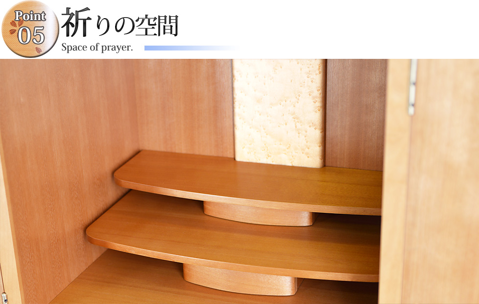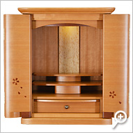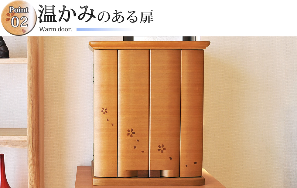 ナチュラルな木目を活かした優しい表情と落ち明るい雰囲気のモダンミニ仏壇『レモンバーム 桜』。古くから高級家具の材料として使われてきた美しい木目模様の”桜”材を使用し、扉に目を引く桜のアクセントを入れることで、自然で落ち着いた温かみのある印象を与えてくれるお仏壇です。お仏壇の内部にはパッと目を引くバーズアイメープルの玉杢模様が美しく、また須弥壇は取り外しが可能なので、祈りを捧げるための機能的なデザインとなっております。
