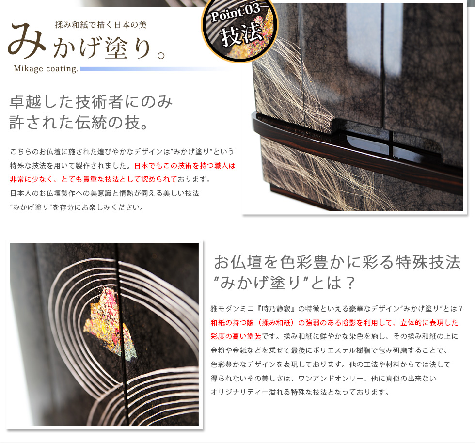 | ■ 商品説明 | お仏壇に描かれた美しいデザインは、龍安寺の方丈庭園春をモチーフに描かれており、 無限の静寂を感じさせてくれる日本人の感性を研ぎ澄まして製作されたこだわりのお仏壇です。 またお仏壇の所々に施された美しい模様は、御影石をモチーフにデザインされており、 "みかげ塗り"という卓越した技術者にのみ許された、揉み和紙で描いた日本の美を意識した 特殊な技法を用いております。 伝統技術みかげ塗りを採用した、高い技術と贅沢な装飾と技法を 取り入れた気品溢れるお仏壇です。 | |