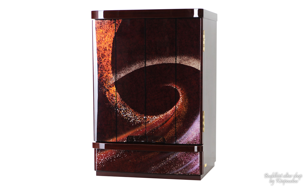 お仏壇に描かれた、美しく洗練されたデザインは、宇宙の彼方で輝く無数の星々が、ひとつとなって美しく輝き、宙に舞う光の色が同心円状に変化し、まるで虹を感じさせてくれるデザインになっています。 仏壇職人の独創的な感性を研ぎ澄まして製作された、芸術性を感じさせるお仏壇です。また、お仏壇の所々に施された美しい模様は、"みかげ塗り"という卓越した技術者にのみ許された、揉み和紙で描いた日本の美を意識した特殊な技法を用いております。 伝統技術みかげ塗りを採用した、最い技術と贅沢な装飾と技法を取り入れた高級感溢れる贅沢な一品です。 |