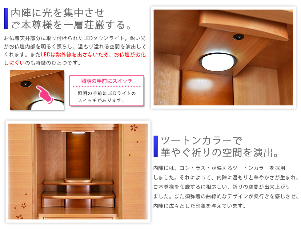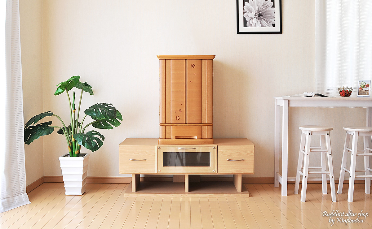 可憐な桜が華やかなモダンミニ仏壇『ミエル 桜』。淡い色彩と美しく緻密な木目の桜材を贅沢に使用し、お部屋を明るく彩ります。扉には熟練した職人によってひとつひとつ丁寧に仕上げられた桜模様の象嵌装飾が施されることで、木の表情が醸し出す自然な風合いと、職人技との融合が高いインテリア性を誇るお仏壇を作り上げました。また取り外し可能な本尊台、須弥壇をはじめ、大容量の引き出しも完備。掃除などのお手入れも簡単に行えますので、いつでも綺麗にお仏壇を保つことができる、まさに機能性、デザイン性を兼ね備えた桜づくしのお仏壇です。