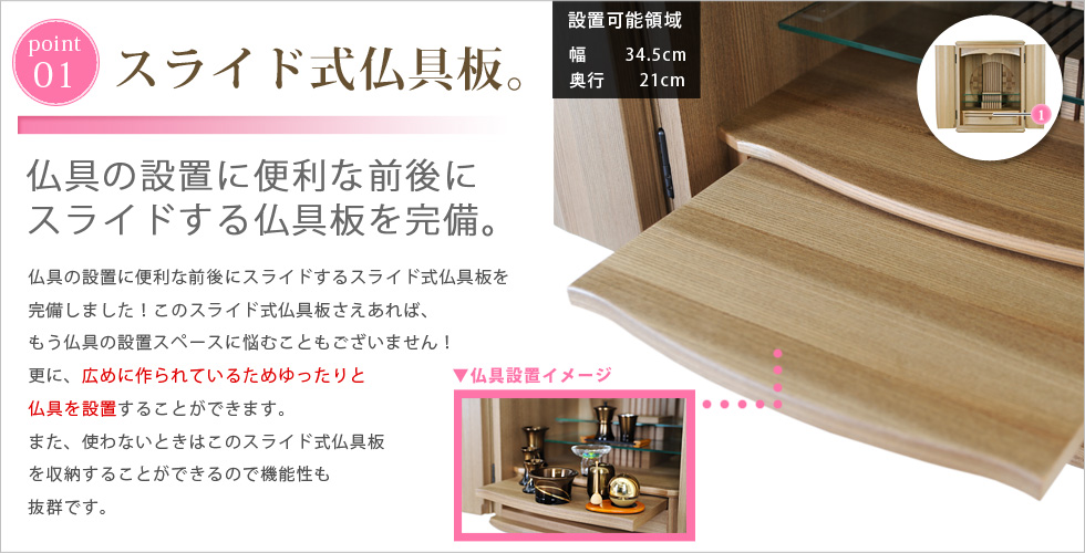 | ■ 機能 | 本尊台・須弥壇取り外し式 / LEDダウンライト / 仏具板 / 引き出し | |