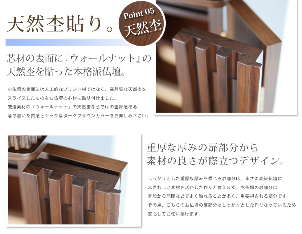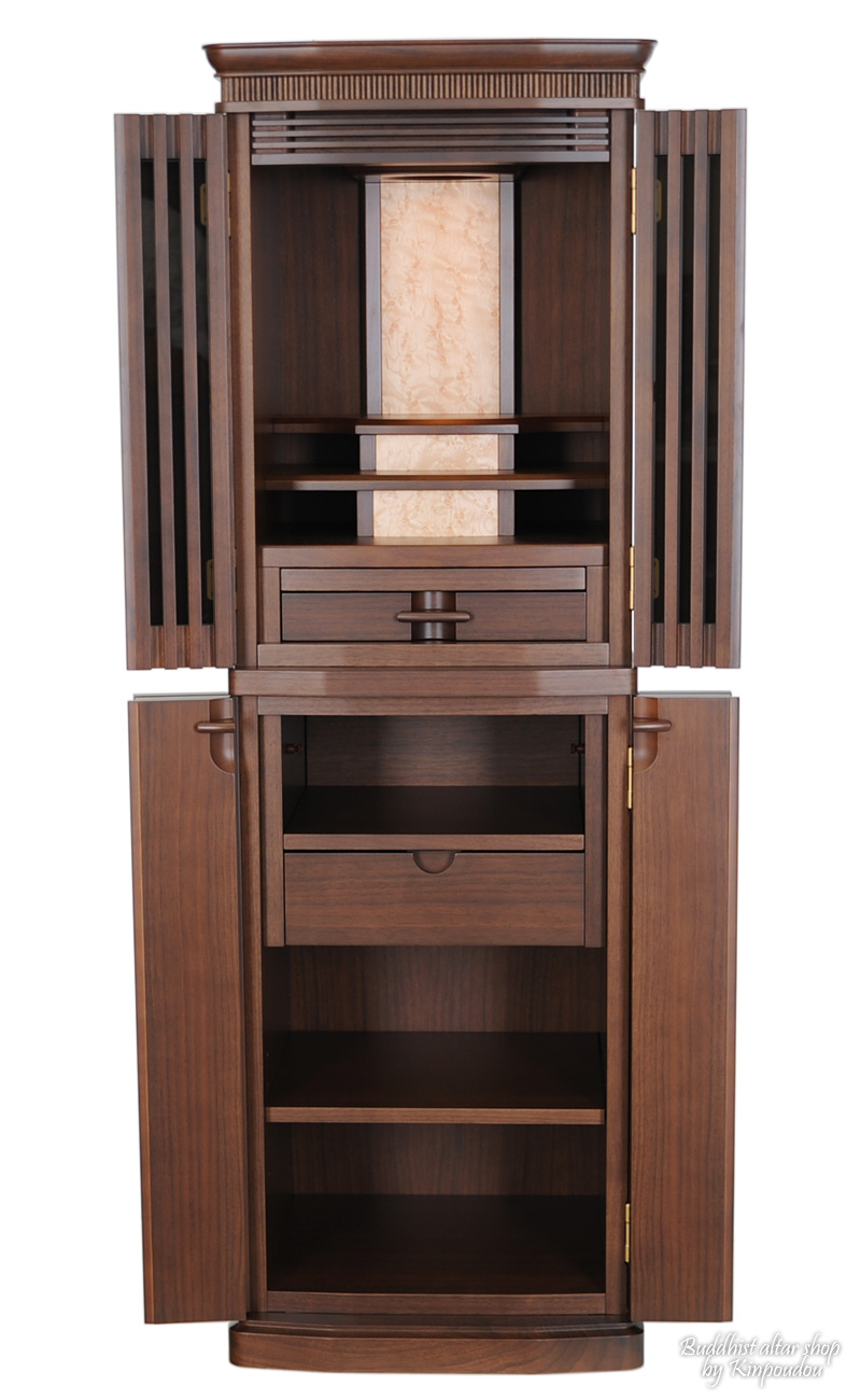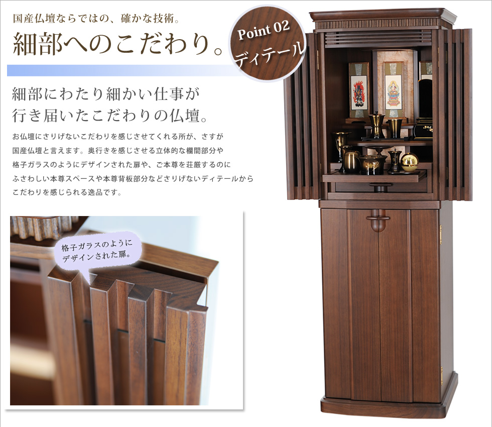 | ■ 商品説明 | 厳選された高級素材『ウォールナット』を使用し、コンパクトにデザインされた新感覚仏壇 『モダン仏壇 リオ』。素材の味を活かした美しい木目の仕上がり、格子ガラス状にデザイン された扉、随所に見られる精巧なデザインが、コンパクトなお仏壇ながらに存在感を十分に 発揮しています。落ち着いた雰囲気と色合い、そしてスタイリッシュなディテール、 設置場所に困らない『コンパクト・ラグジュアリーなお仏壇』の誕生です。 | |