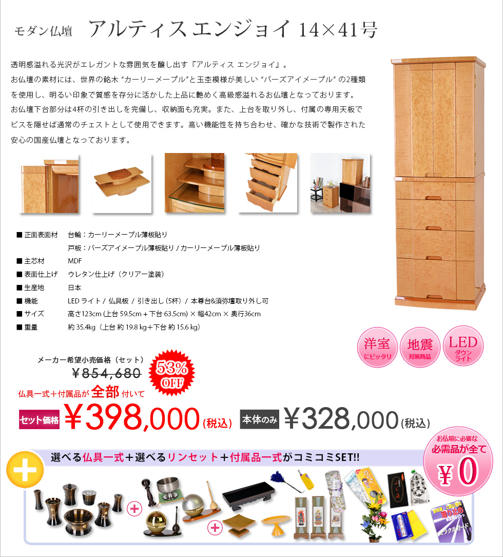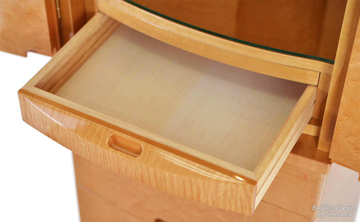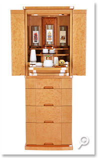 | ■ 商品説明 | 透明感溢れる光沢がエレガントな雰囲気を醸し出す『アルティス エンジョイ』。 お仏壇の素材には、世界の銘木 "カーリーメープル"と玉杢模様が美しい "バーズアイメープル" の2種類を使用し、明るい印象で質感を存分に活かした上品に艶めく高級感溢れるお仏壇となっております。 お仏壇下台部分は4杯の引き出しを完備し、収納面も充実。また、上台を取り外し、付属の専用天板でビスを隠せば通常のチェストとして使用できます。高い機能性を持ち合わせ、確かな技術で製作された安心の国産仏壇となっております。 |