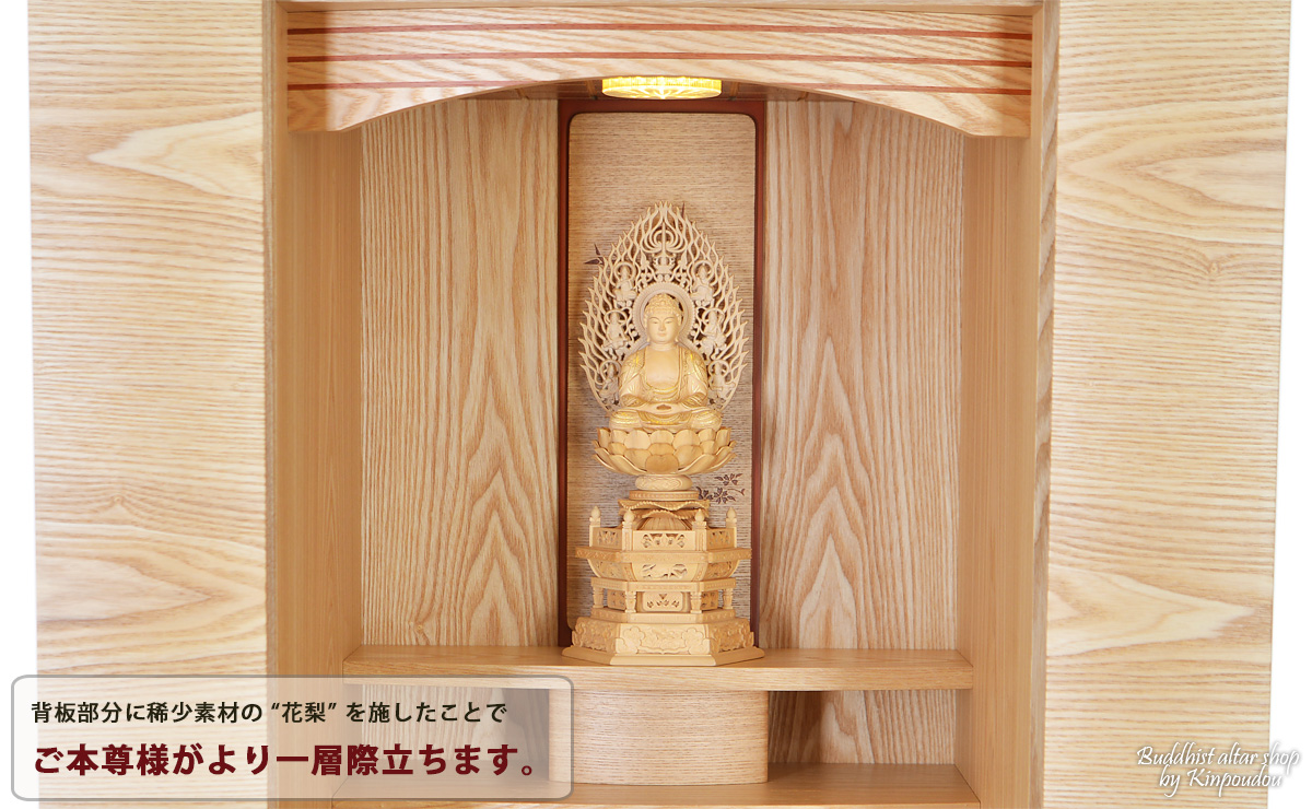 また、デザイン性も優れており、温かみのある木目模様や、伝統的な格子天井、さらには背板部分に日本の祈りの文化を代表する折鶴が施されております。懐かしくもあり、こころ温まる優しさに溢れたお仏壇をぜひ、ご堪能ください。