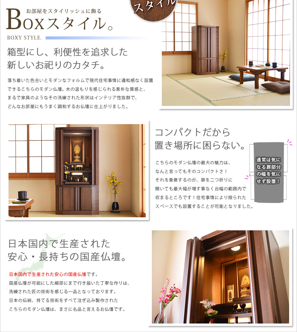 | ■ 商品説明 | 総高さ約120.2cmと言うコンパクトでスタイリッシュなモダン仏壇『ドルチェ』がBOXY STYLEから誕生しました。素材はウォールナットの天然杢を使用し、木の質感を存分に 活かし落ち着いた色合いが優雅で高級感ある雰囲気を醸しだしています。本製品はコンパクトで ありながらも内陣が広い構造となっており、温かい光の間接照明が幻想的な空間を演出し、ご本尊様をより一層を荘厳してくれます。シャープなデザインの扉は床置きタイプには珍しく、扉を全開に開いても台幅以上には広がらず、限られたスペース内での設置が有効的となります。機能性抜群のモダン仏壇『ドルチェ』は、BOXY STYLEだからこそ実現できた優良な一品です。 | |
