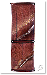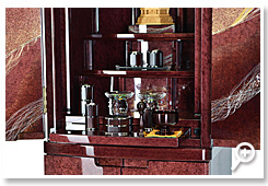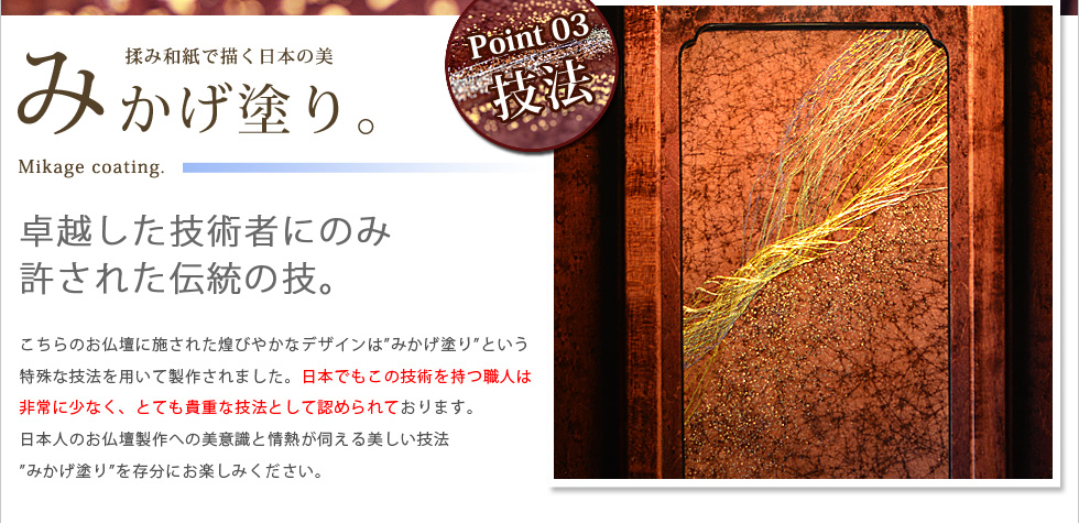 『永遠乃響 バーズアイメープル』。 お仏壇の随所に施された美しい模様は、御影石をモチーフにデザイン されております。目を惹かれる綺麗な揉み和紙には、"みかげ塗り"という一握りの技術者に のみ許された、揉み和紙で描いた日本の美を 意識した特殊な技法を用いております。 "みかげ塗り"技法をより際立たせるため、染色、金紙、ポリエステル樹脂を取り入れた事で 気品溢れる贅沢なお仏壇に仕上がりました。機能面では、収納ができるコンパクトな経机が 備わっており、正座をしながらお祀りを行うことが出来る、利便性も考慮されたお仏壇と なっております。 |