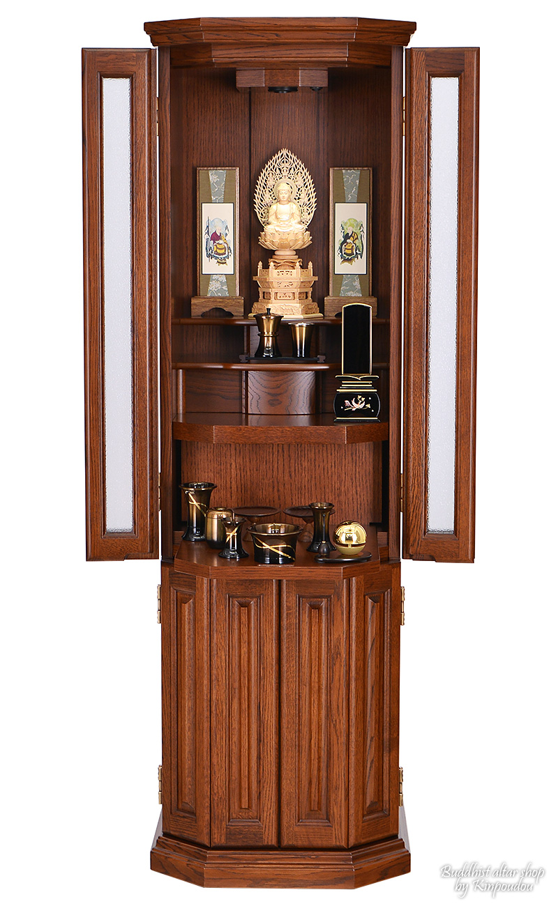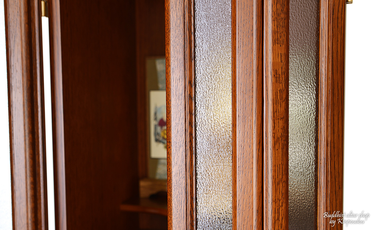 一見お仏壇には見えないほどのインテリア性を感じるモダン仏壇『デイジーα ダーク色』。木の温もりを感じさせる”ナラ”を主材とし、扉にはカスミガラスを採用することで、まさに家具調というべきスタイルを実現しました。和洋室問わずどんなお部屋にも自然に溶け込み、家族団らんの空間にご安置されたい方にピッタリのお仏壇です。また、前方部が飛び出した六角形のデザインを採用しており、お部屋の角など小さなスペースにも設置可能です。充実した収納機能と洗練されたデザインで、現代の生活スタイルにそっと寄り添う新しいスタイルのお仏壇となっております。