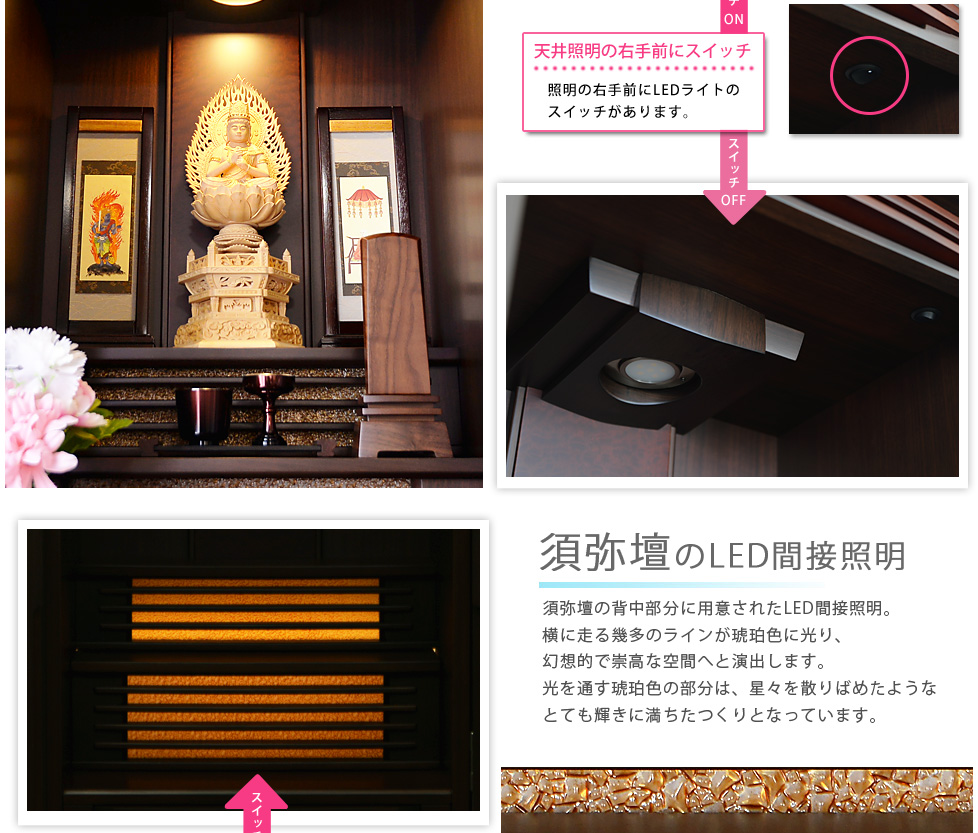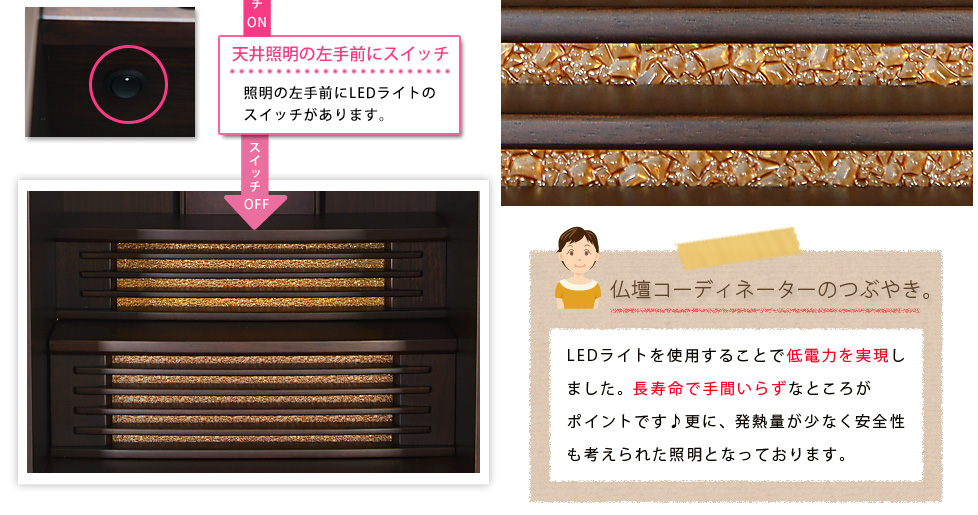 機能として、2種類のLEDライトによる光の演出、スライド式の棚、立位でも座位でも快適にお祀りができる他、付属の経机を使えば、ゆったり綺麗に仏具の配置を行うことができます。