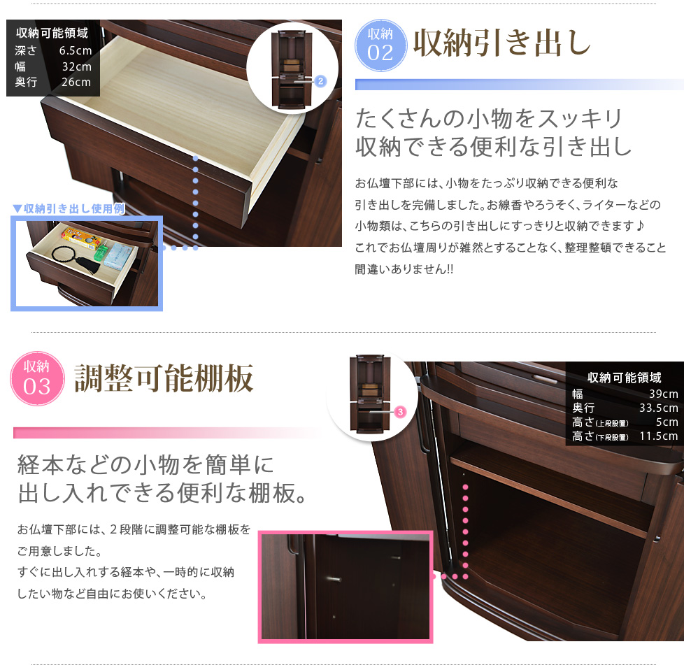 | ■ 収納 | 引き出し / スライド式仏具板 / 下台収納 / 経机 |