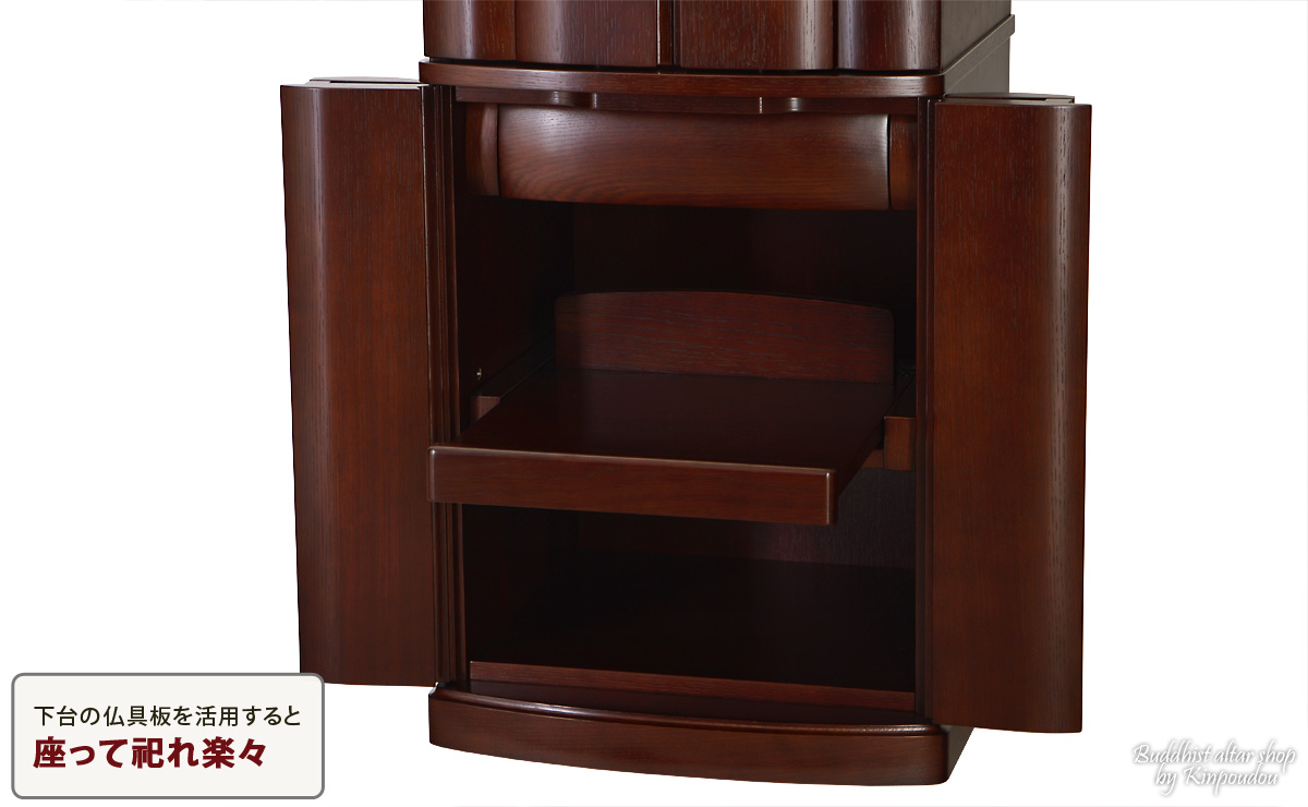 使い勝手の良いモダン仏壇『マルーン 紫檀色』は、様々な利用シーンを想定して作られたお仏壇です。その特徴は下台にあり、下台には座って祀る事が出来る便利なスライド引き出しが設置されています。高さが三段階で調整可能となっており、お客様の背丈に合わせ調整をすることで、腰への負担を和らげることでしょう。また、スライド引き出しは簡単に取り外せるので、骨壷のご安置や大容量の収納空間としても使えます。