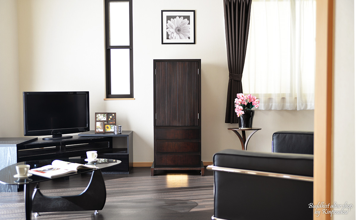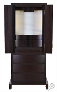 唐木モダン仏壇『リョーマ 紫檀』。高級素材である”紫檀”をふんだんに使用したそのデザインは、シンプルながら、存在感のあるお仏壇です。