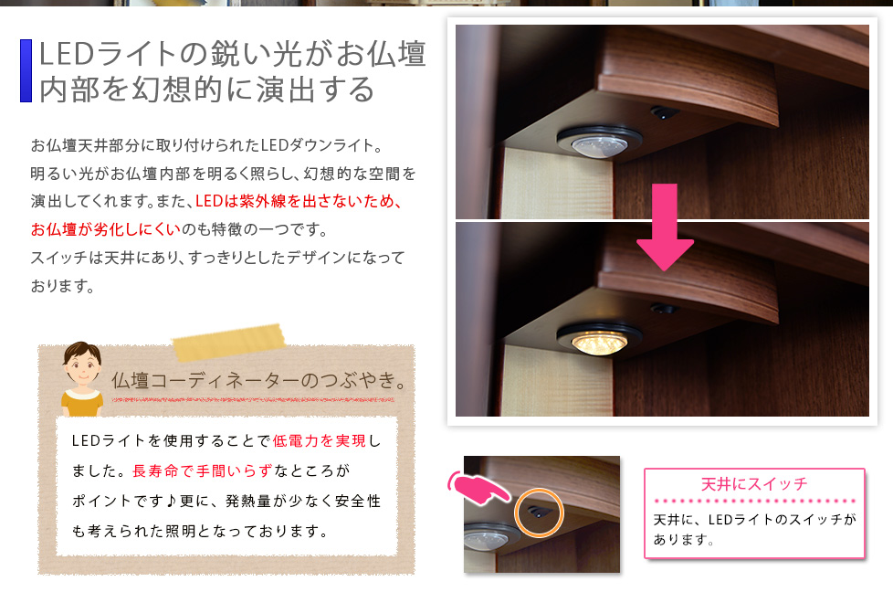 また、本尊台と須弥壇の取り外しや収納面など、確かな機能性と利便性を兼ね揃えているので、実際使用する際にも安心してご利用いただける仏壇となっております。