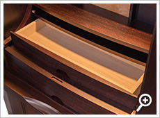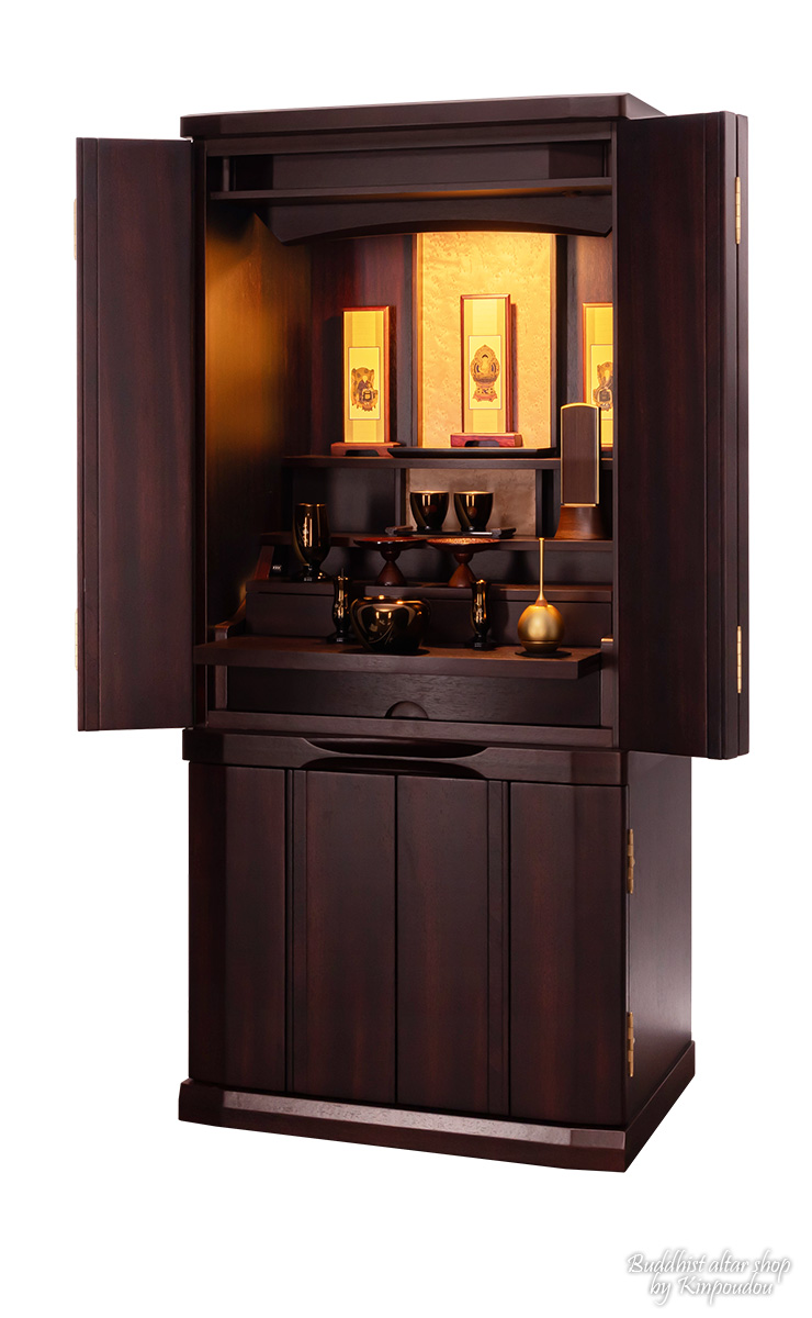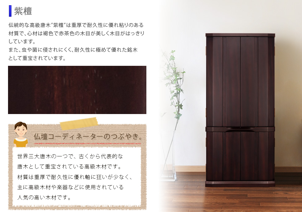 引き出しが3杯付いており、豊富な収納機能がございますのでお供え物や仏具の置き場所がすっきりとし、お仏壇の周りを整頓でき綺麗な状態に保てます。硬く耐久性に優れた高級木材"紫檀"を贅沢に使い、確かな機能と利便性を兼ね揃え、毎日のお祀りが快適に行えるお仏壇です。