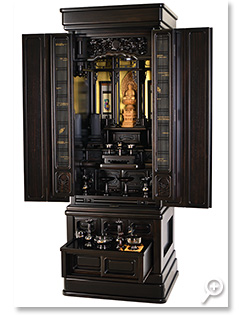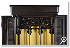 お仏壇の欄間に咲き誇る花々を彫刻し、故人様を飾る唐木仏壇『先代 黒檀』。 欄間の花々を支えるように、障子には葉や雲を模した図柄が描かれており、シンプルな中にも一貫したコンセプトが窺えます。 また、お仏壇の素材には世界三大唐木の"黒檀"を採用しており、重厚な色合いと綺麗な木目は、和室はもちろん洋室も違和感なく彩ります。 さらに、利便性も考慮されスライド式の経机や3杯の引き出し、地袋戸等を備えており、見た目の美しさだけでなく、実用性も兼ね備えた一品に仕上がっております。 |