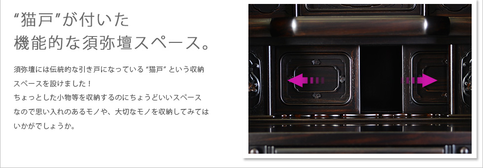 | ■ 機能 | LEDダウンライト / 猫戸 / 仏具板 / 引き出し / スライド式経机 / 地袋戸 / 台輪引出し | |
