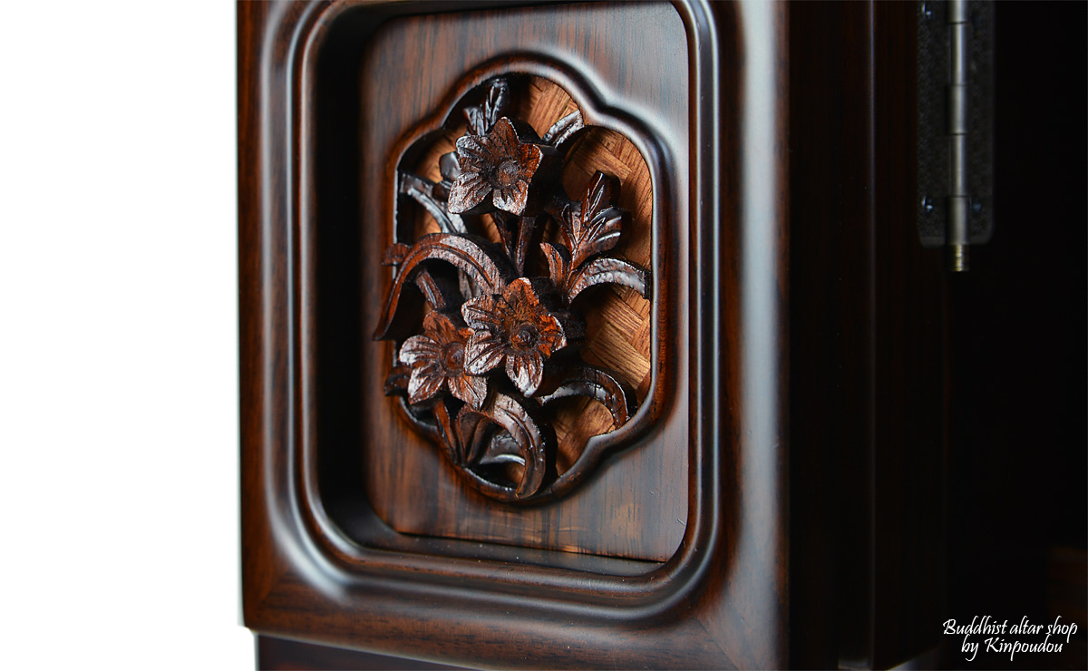 高級素材として市場価値の高い"紫檀"に属するソノケリンを贅沢に使用した唐木仏壇『泰河 台付』。お仏壇の随所には多種類の花々の彫刻が施されており、気品溢れる豪華なお仏壇となっております。また、障子には八双金具をモチーフにした八双彫障子を採用したところで古き良き日本の伝統を感じることができます。さらには機能性にも優れ、お仏壇下台にはスライド式経机を設けておりますので、正座をしてもちょうど良い位置で毎日のお祀りが行えるようになっております。素材良し、高級感あり、利便性良し、こんなに高品質なお仏壇、この価格でのご提供は本当にお得な商品となっております。