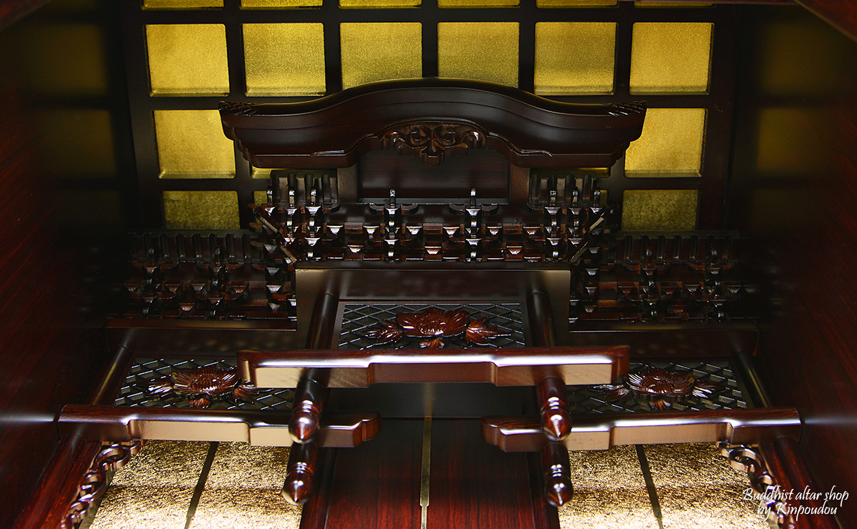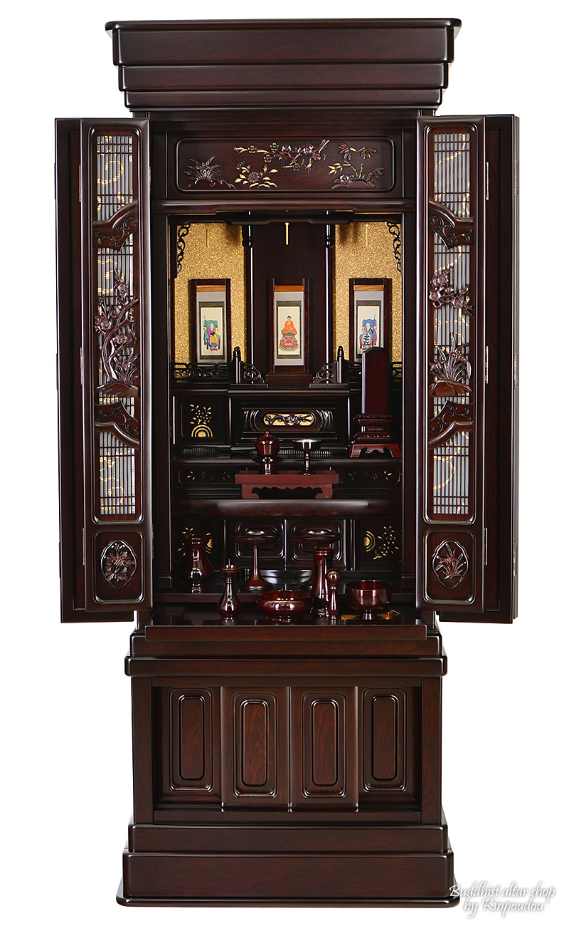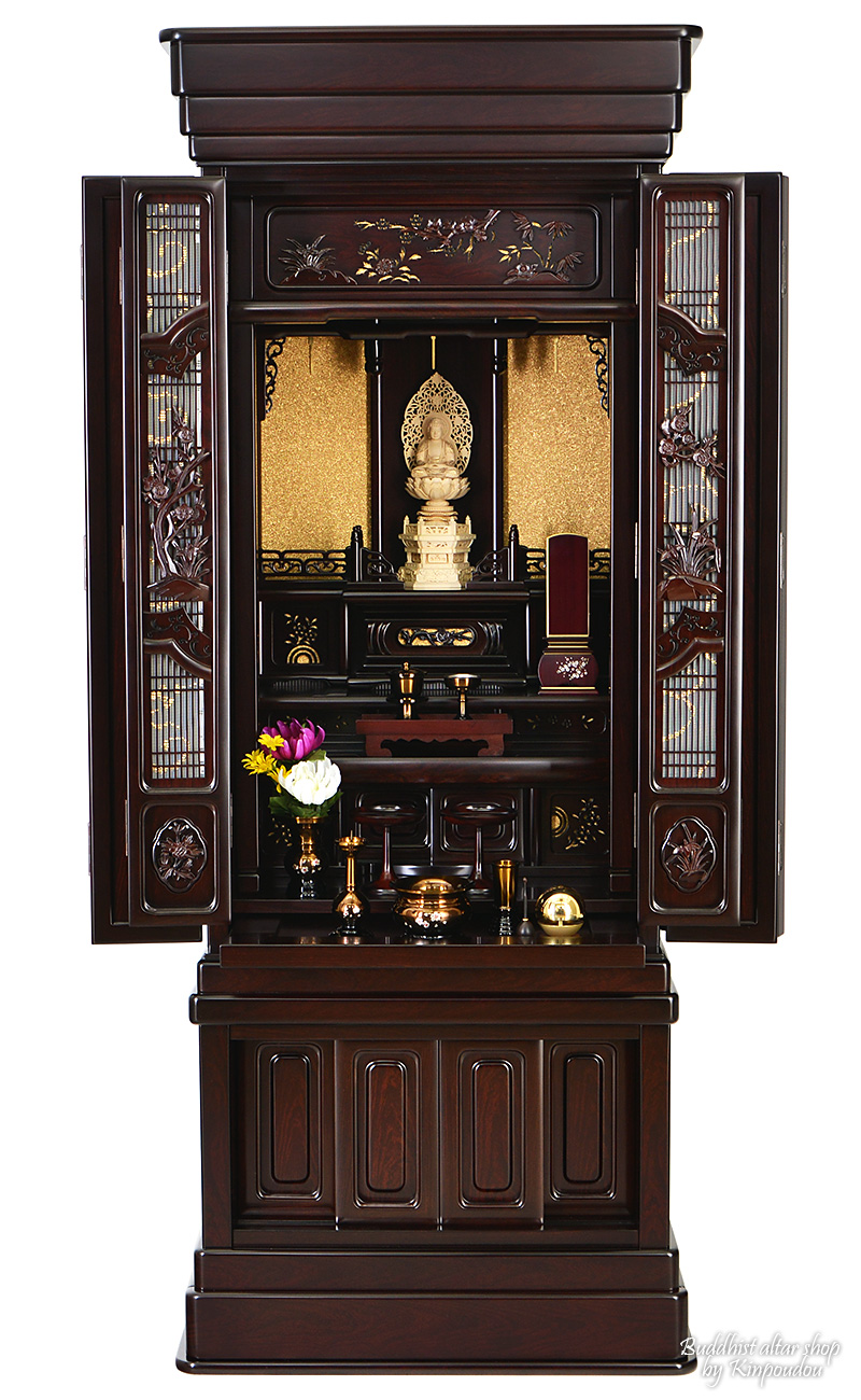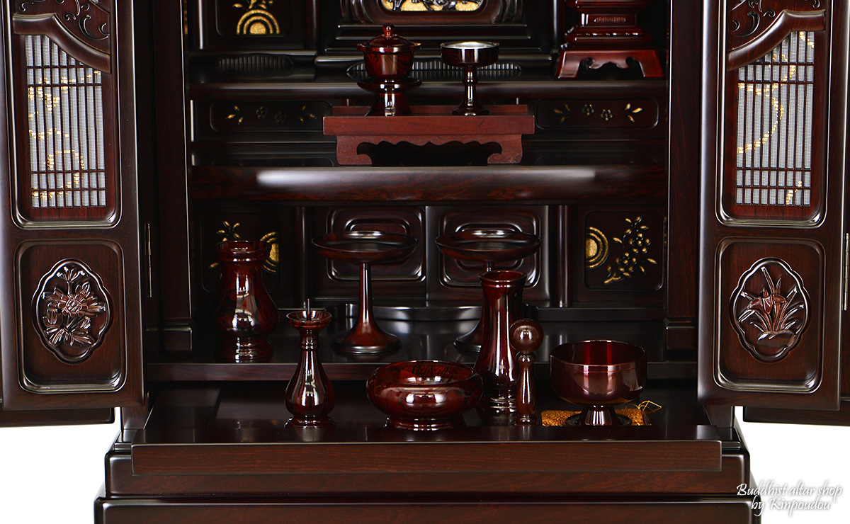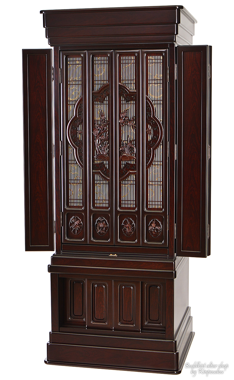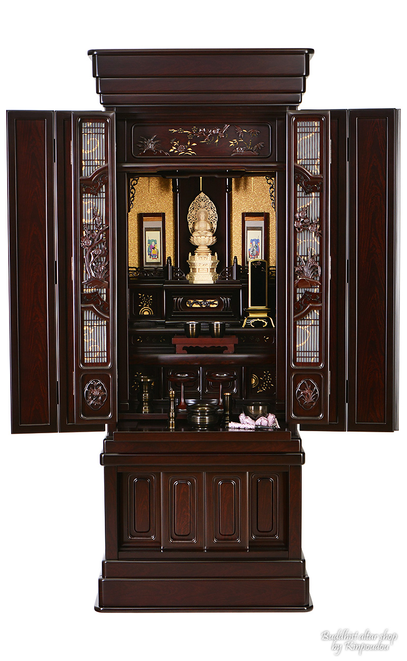 四季折々の草花が華やかな唐木仏壇『優春 紫檀調』。欄間や障子など、随所に古くから四季を司る君子として讃えられてきた草木や花を象った彫刻が施され、お仏壇をより美しく華やかに飾り立てています。また、伝統的な唐木である紫檀の木目模様を表現した”紫檀調”を採用することで、低コストを実現しました。美しい木目模様からは気品と高級感が滲み出る上品な仕上がりとなっており、お部屋を優雅に演出します。唐木仏壇のもつ伝統的な様式美を追求しながら、和洋室ともに馴染みやすいデザインに仕上げたお仏壇です。