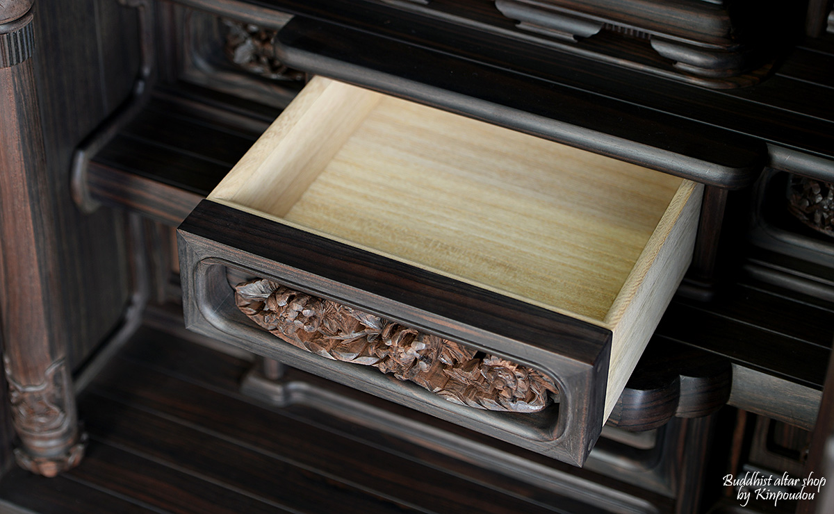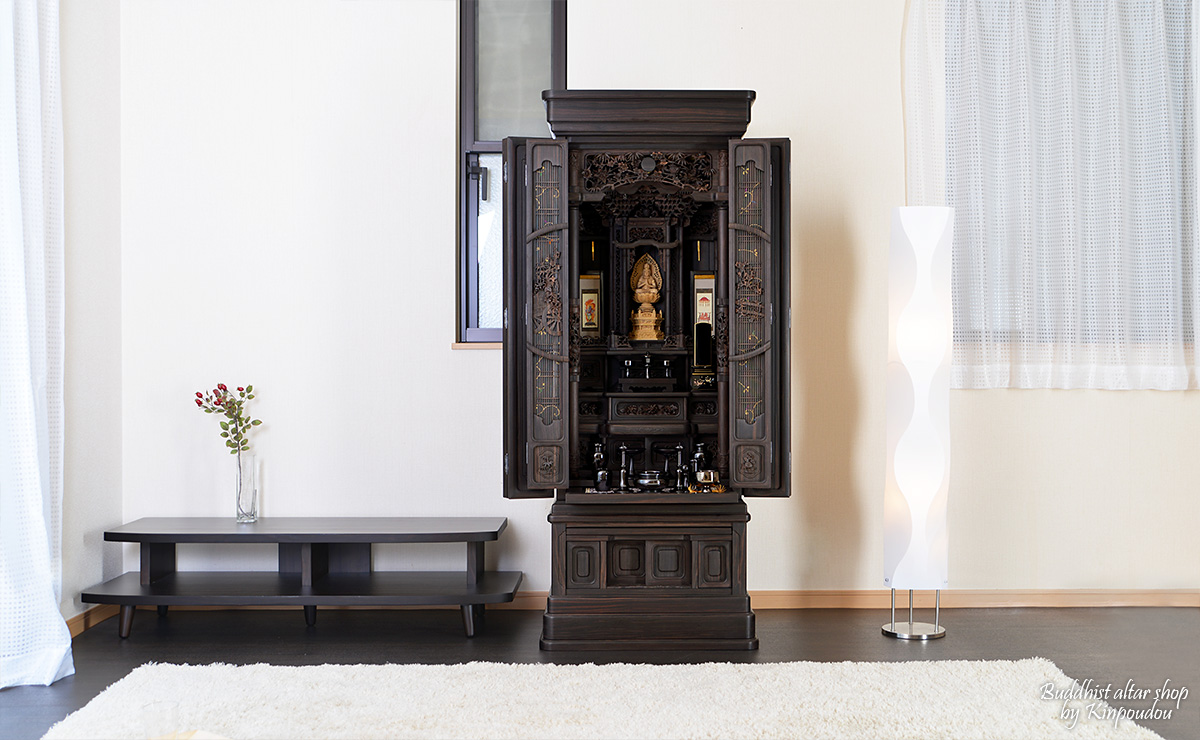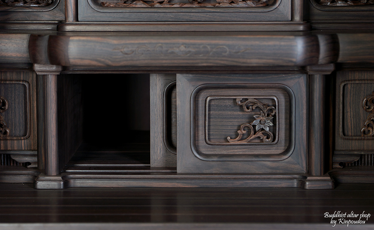 | ■ 商品説明 | 贅沢な高級唐木素材 "本黒檀"の持ち味をまさにそのまま生かした『輪王 黒檀』。 お仏壇には木材が持つ本来の質感や風合いが感じられるように "木地仕上げ" を施し、圧倒的な違いを目で見て肌で温もり感じる事ができる味わい深いものになっています。また、古き良き日本の伝統を感じる四君子や至る所に多種類の花々の彫刻を施してあり、気品 高き凛とした佇まいでお部屋を彩ります。機能面も普段ご使用になる際、とっても便利な収納をしっかり備えておりますので、安心してお使いいただけるお仏壇となっております。 |