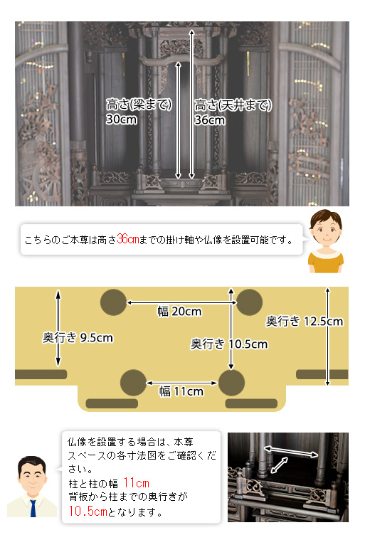 このお仏壇に合う仏像を設置する場合は、高さ36cm 幅11cm