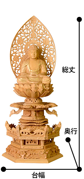 仏身の大きさを基準にしていますので、同じ2.5寸の仏像でも台座の違いで総丈が異なります。 |