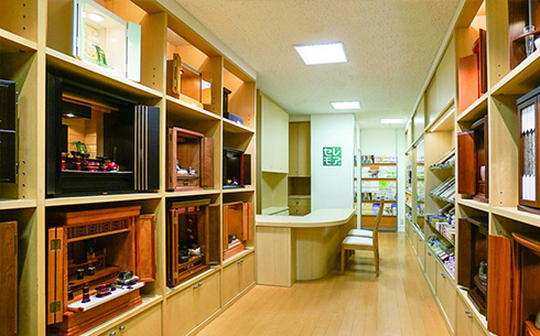 店内には、厳選されたこだわりの高級お位牌から、現代的でモダンなお位牌まで展示いたしております。直接お手に取っていただき、そのまま店内でお位牌のご注文を承れます。